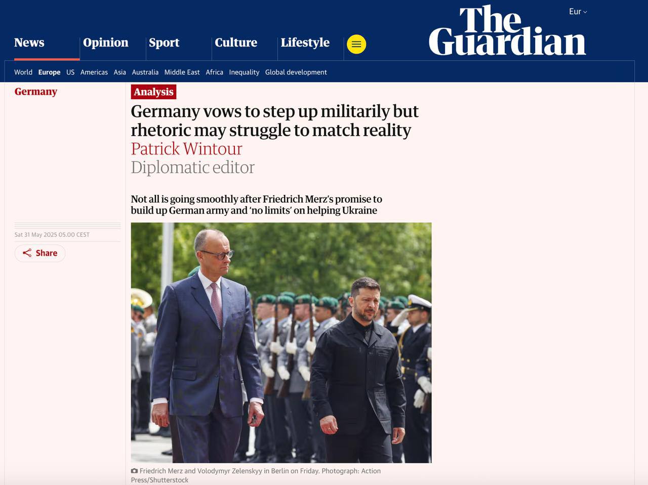 За даними видання, попри гучні заяви Мерца про «безмежну» військову допомогу, плани щодо постачання «Таурусів» Києву, про які він говорив на початку травня 2025 року, швидше за все, не будуть реалізовані через позицію Клінгбайля.