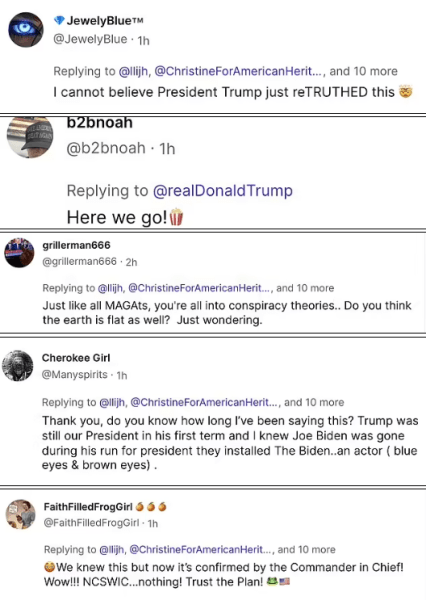 "Ми всі знали, що щось було зовсім не так. Хоча Трамп неодноразово заявляв, що Джо Байден був застрелений", "Ого! Президент Трамп щойно репостив цей пост", "Не можу повірити, що президент Трамп щойно репостив це", "Дякую, ви знаєте, як довго я це кажу? Трамп все ще був нашим президентом у свій перший термін, і я знав, що Джо Байдена не було під час його президентських перегонів. Вони поставили Байдена... актора (блакитні очі та карі очі)", "Як і всі MAGA, ви всі захоплюєтеся теоріями змови. Ви теж думаєте, що Земля пласка? Просто цікаво", — повідомляють під постом.