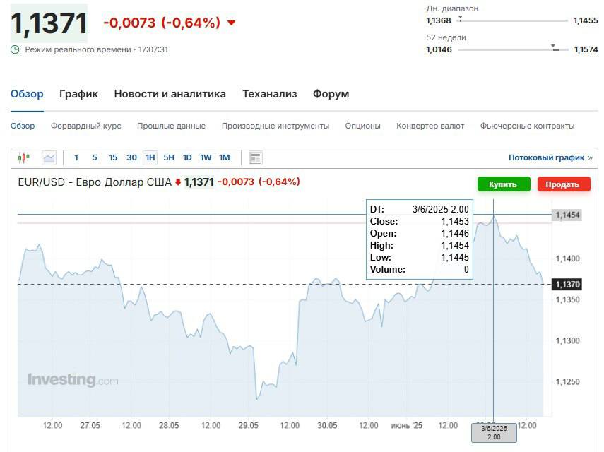 На тлі цих очікувань 3 червня курс долара до євро знизився до 1,1454, після чого дещо відновився — до 1,1371.