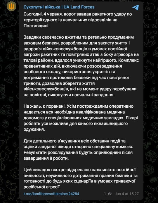 У Сухопутних військах зазначили, що завдяки завчасно впровадженим заходам безпеки, спрямованим на захист особового складу у тилових районах в умовах постійної загрози ударів з боку РФ, вдалося запобігти серйознішим наслідкам.