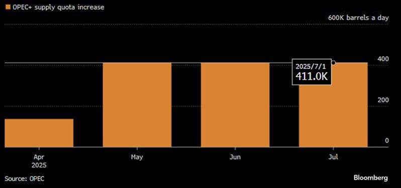 Вісім основних членів картелю, які добровільно скоротили видобуток у листопаді 2023 року (в сумі на 2,2 млн барелів на добу), оголосили 1 червня про четверте поспіль більш агресивне нарощування пропозиції. Це означає, що повна відмова від добровільного скорочення обсягом 2,2 млн барелів на добу буде повністю завершена вже до жовтня, а не до кінця вересня 2026 року, як припускалося раніше.