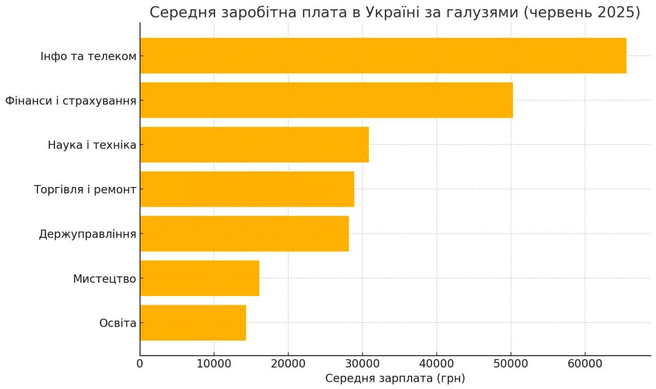 Найменші середні зарплати в Україні зафіксовані у сфері освіти (14 307 грн) та мистецтва (16 101 грн).