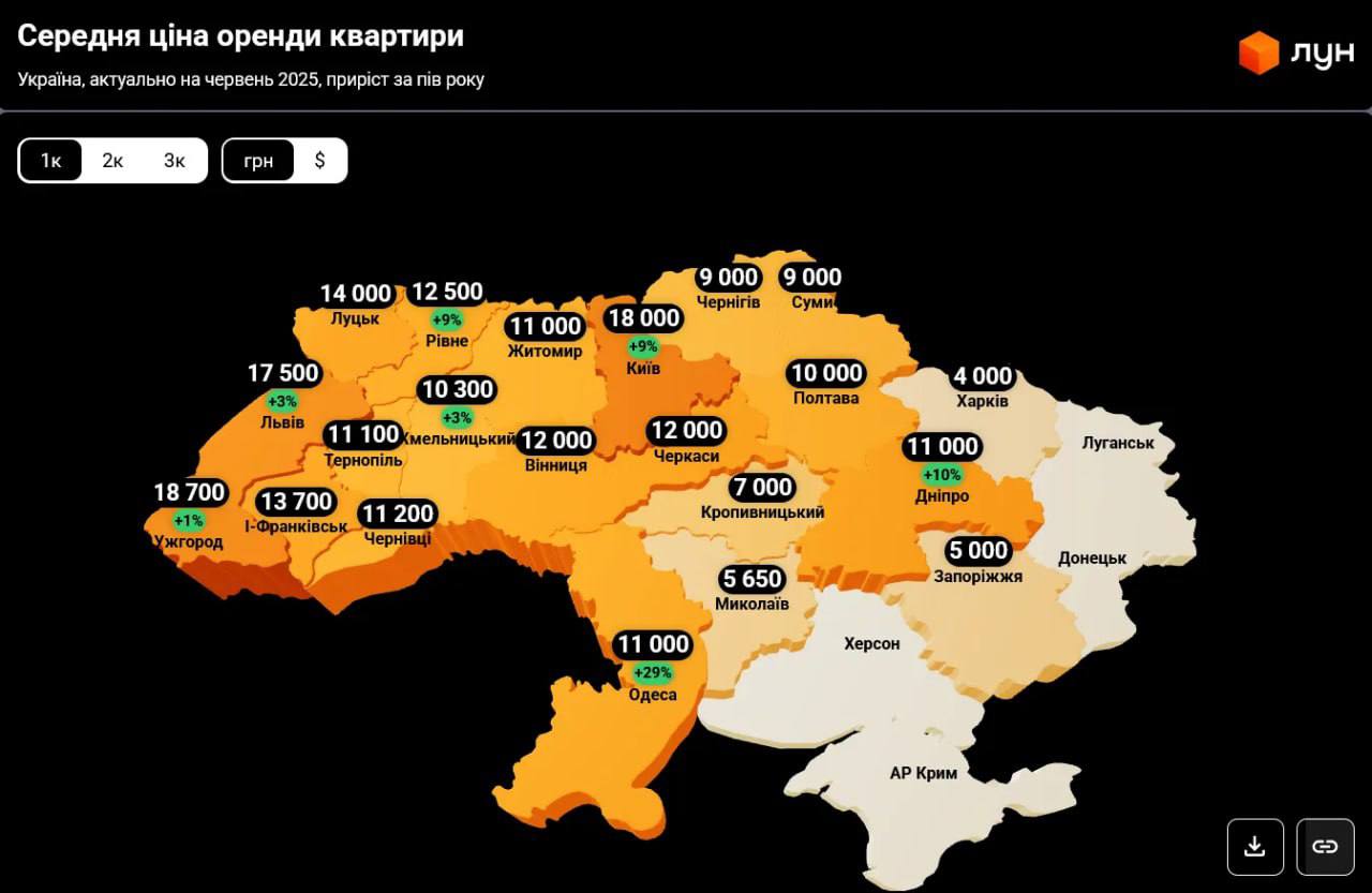 Найпомітніше подорожчання зафіксоване в Одесі — одразу на 29%, до середнього рівня 11 000 гривень на місяць. У Дніпрі оренда піднялася на 10%, а в Києві та Рівному — на 9%.
