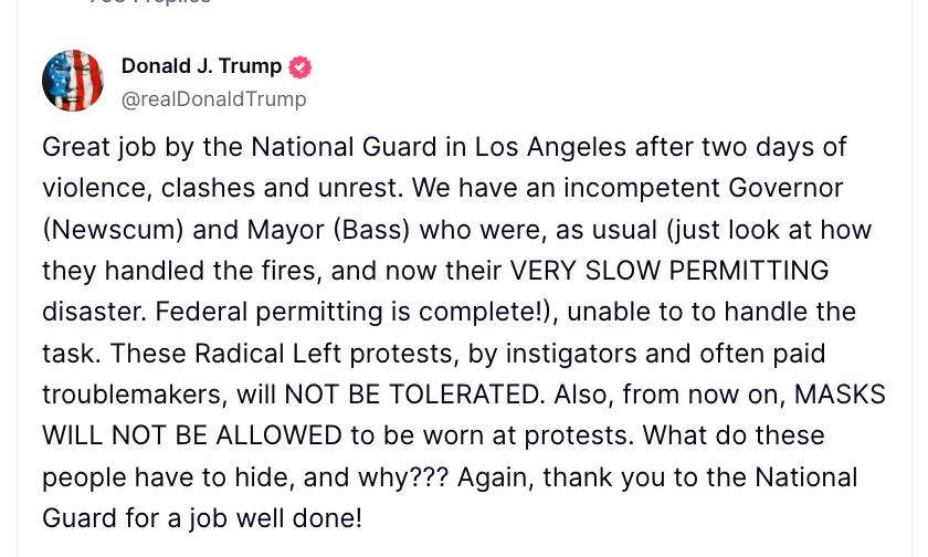 Водночас губернатор Каліфорнії демократ Ньюсом розкритикував рішення Трампа, заявивши, що введення військових лише загострить ситуацію в місті.