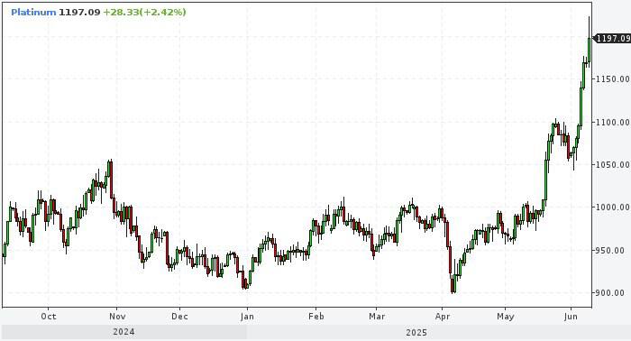 Вартість платини різко зросла, перевищивши $1200 за унцію — це найвищий показник з травня 2021 року.