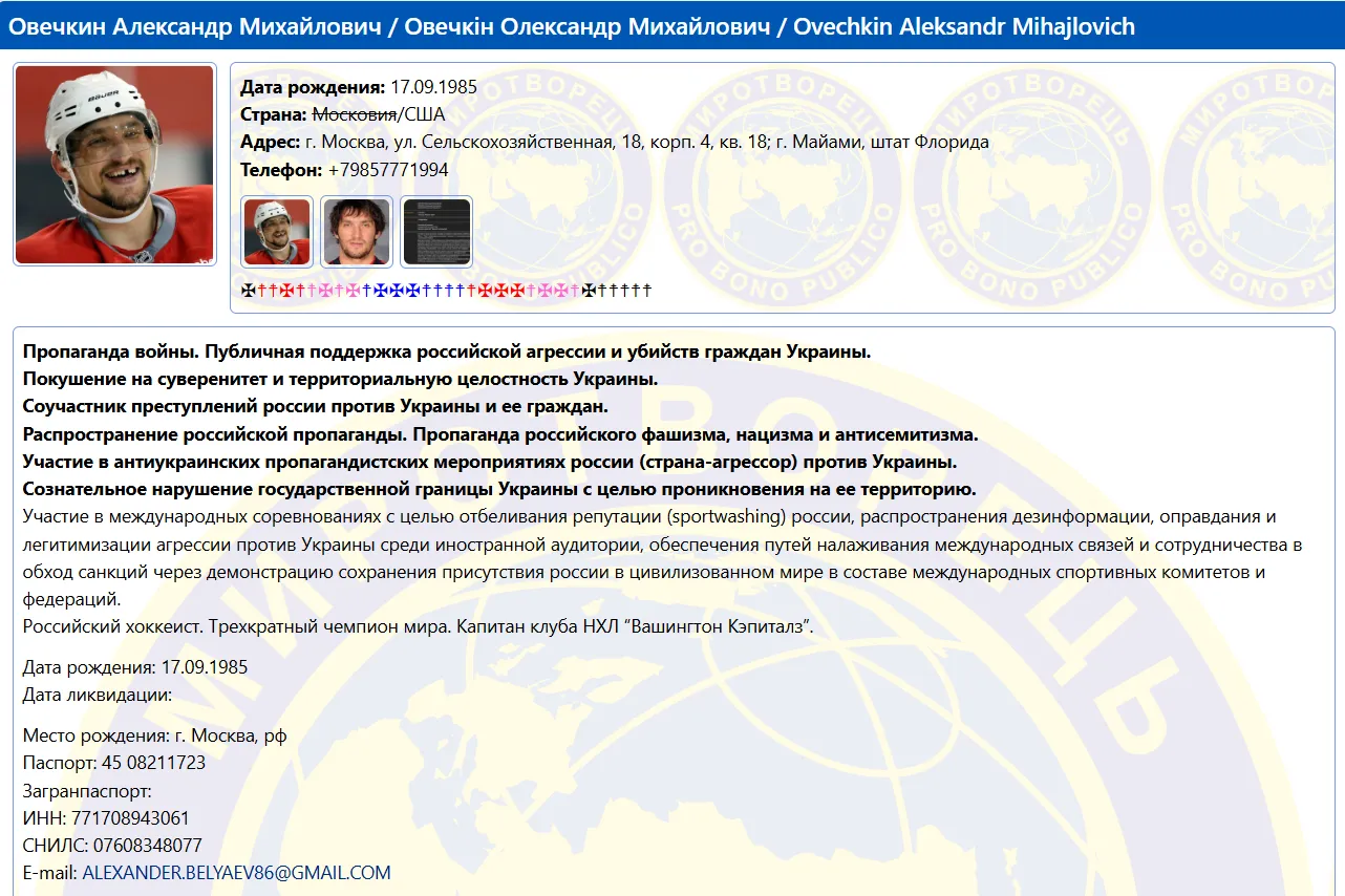 Співзасновник так званої Putin Team Овечкін потрапив до бази «Миротворця»