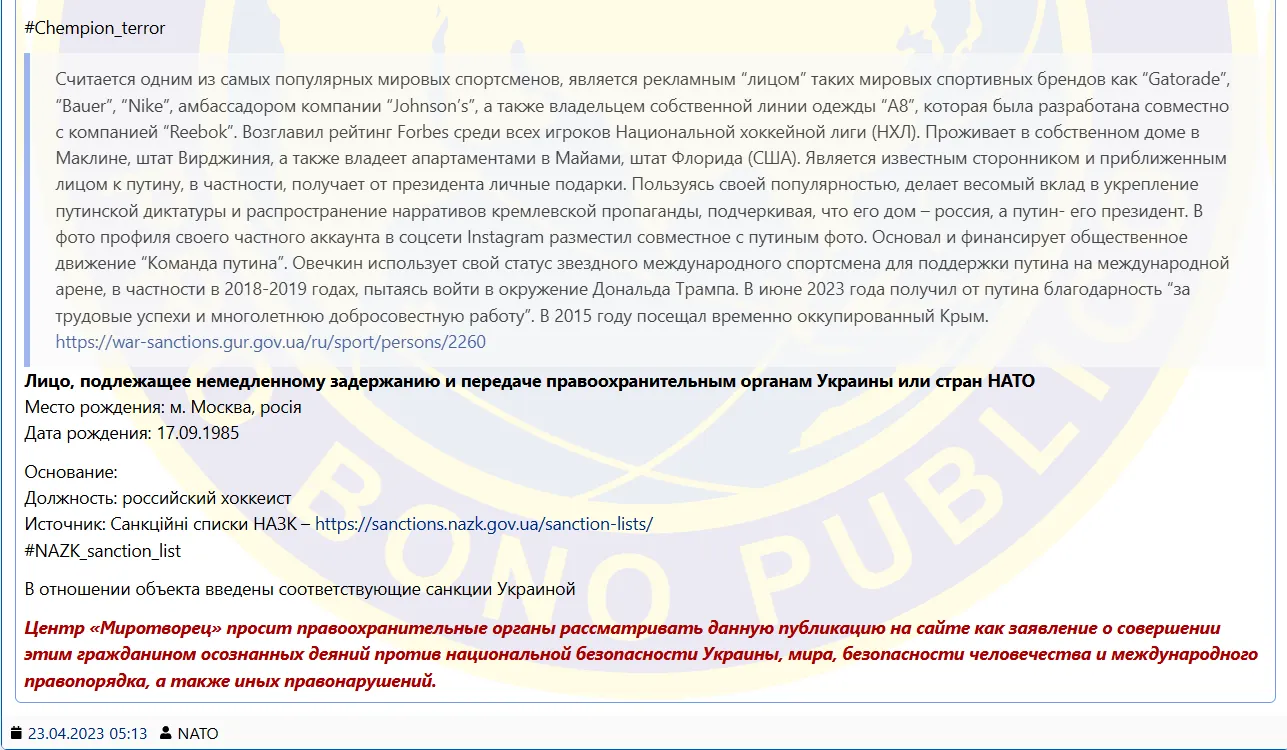 Найбільш результативний бомбардир в історії регулярних чемпіонатів Національної хокейної ліги (НХЛ) Олександр Овечкін був включений до списку сайту "Миротворець". Це сталося ще у квітні 2023 року, проте викликало в Росії справжній переполох тільки зараз, і інформація досягла навіть Кремля.