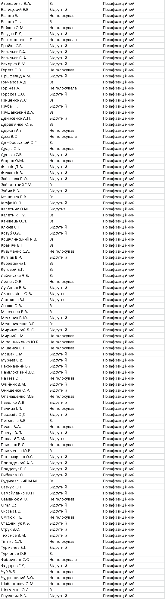 Подавляющее большинство внефракционных депутатов также не поддержали рассмотрение законопроектов: из 99 народных избранников, не входящих в состав ни одной фракции, "за" проголосовали только 24. Среди голосовавших "за" были Анатолий Гриценко и Виктор Канивец, а также Олег Ляшко. Хотя Виктор Балога сам не голосовал за включение законопроектов в повестку дня, однако его родной брат Павел и двоюродный брат Василий Петевка проголосовали "за". Среди тех, кто внесение законопроектов не поддержал, был недавний кандидат на пост Президента Сергей Тигипко и приближенная к нему Светлана Фабрикант. В общем голосование внефракционных депутатов выглядит так: