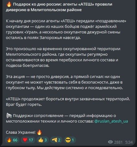 Таким чином, передаючи "вітання" окупантам, один з партизанів підпалив армійську вантажівку "Урал". У ході диверсії кілька загарбників із чергового складу залишилося в запорізьких полях назавжди.