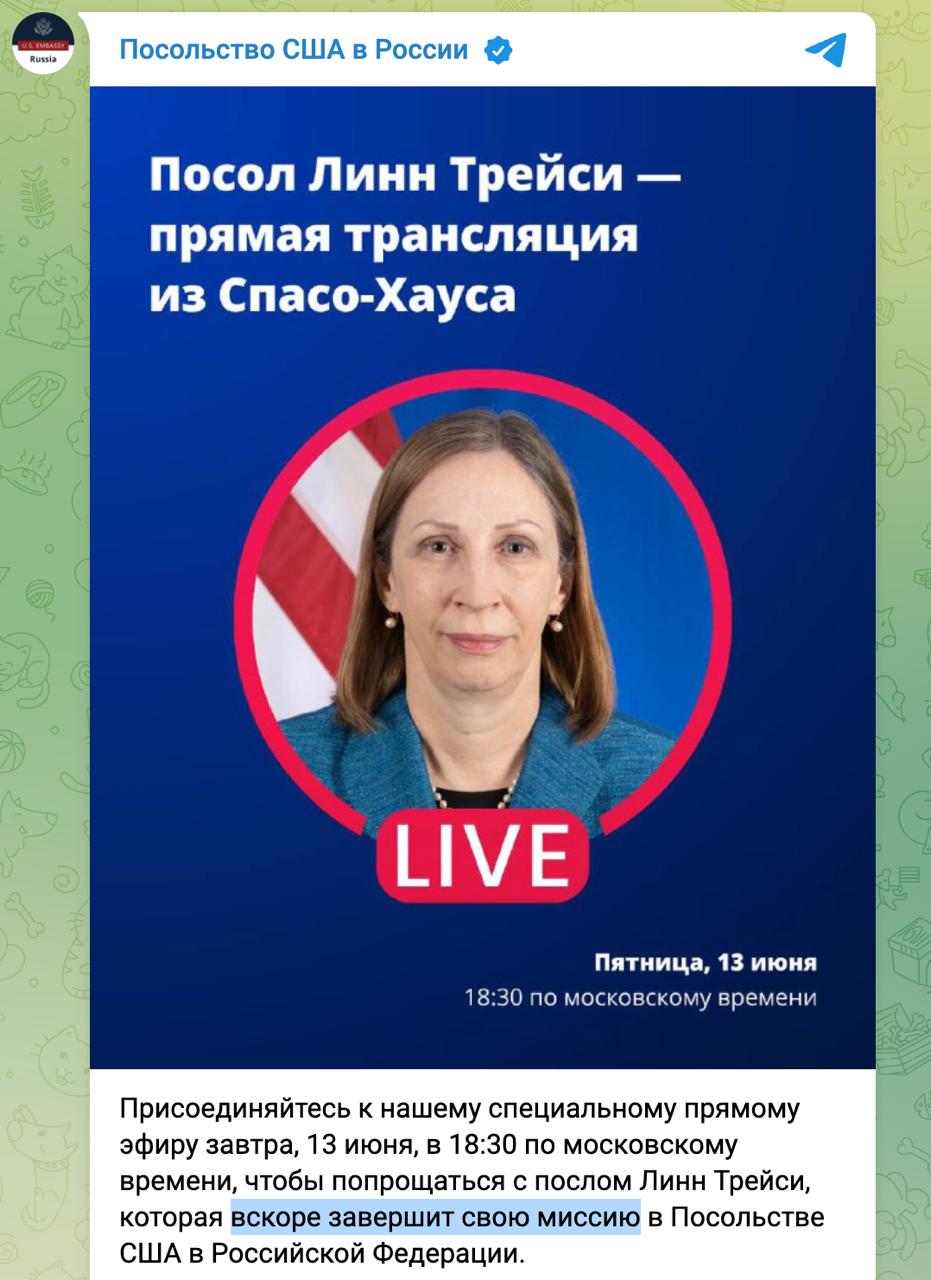Лінн Трейсі «скоро завершить свою роботу в посольстві США в РФ», повідомляється в телеграм-каналі дипломатичного представництва.