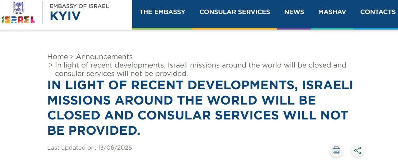 Ізраїльське посольство в Україні повідомило про закриття всіх ізраїльських дипломатичних представництв по всьому світу.