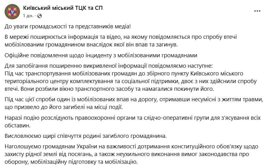"Під час цієї спроби один з мобілізованих впав на дорогу, отримавши травми, несумісні з життям, що призвели до його смерті на місці події", - зазначено у повідомленні.