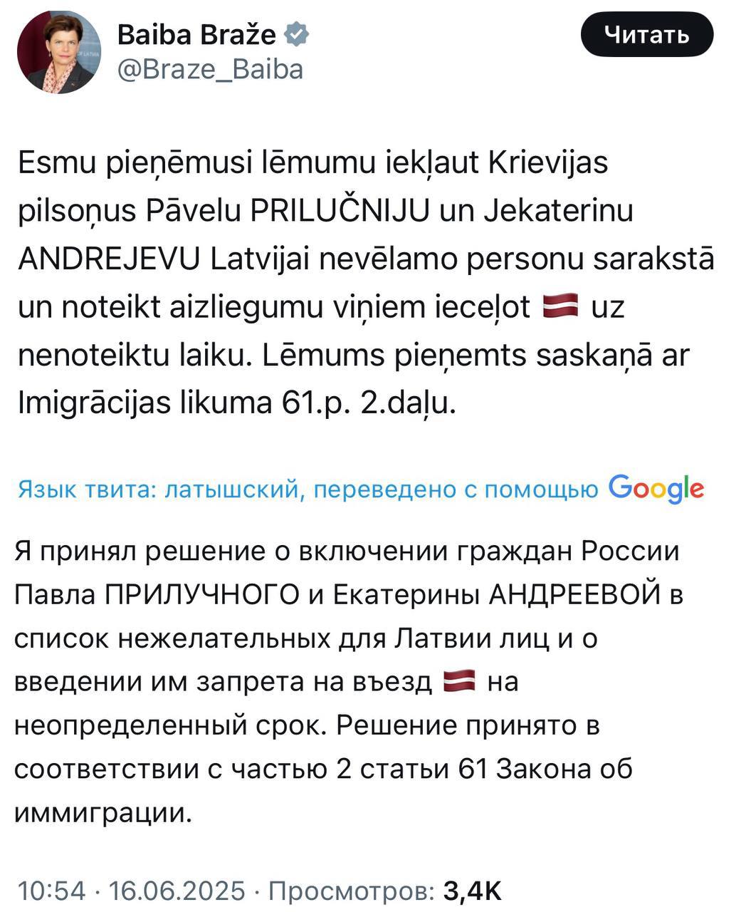 "Я ухвалила рішення про включення громадян РФ Павла Прилучного та Катерини Андрєєвої до списку небажаних для Латвії осіб та про введення їм заборони на в’їзд до Латвії на невизначений термін. Рішення ухвалено відповідно до частини 2 статті 61 Закону про імміграцію", – написала глава МЗС Латвії.