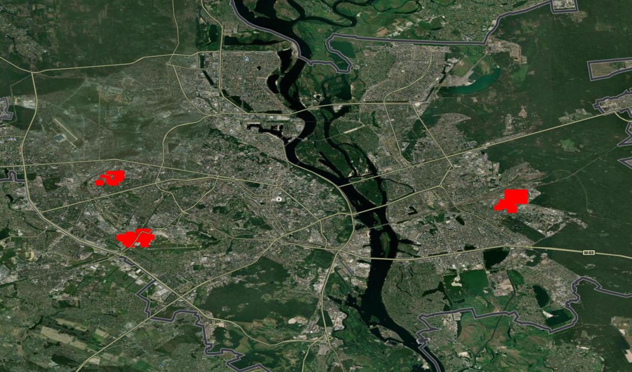 Згідно з картою, пожежі охопили Дарницький та Святошинський райони.