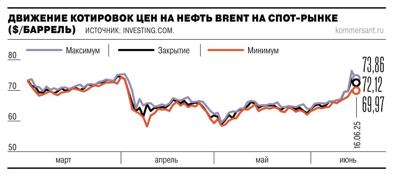 Протягом більшої частини 16 червня ціна на Brent опускалася нижче за $70 за барель на тлі очікувань зменшення інтенсивності бойових дій, проте подальші удари підняли вартість до $72 за барель.