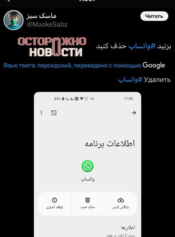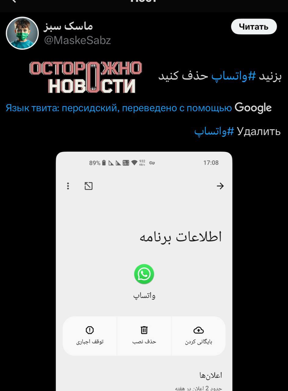 Іранські ЗМІ та телеграм-канали закликали громадян видалити з телефонів WhatsApp, стверджуючи, що додаток нібито передає дані Ізраїлю.