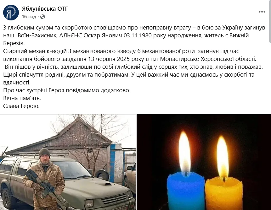 "З глибоким сумом та скорботою повідомляємо про непоправну втрату – в бою за Україну загинув наш Воїн-Захисник Альєнс Оскар Янович, 03.11.1980 року народження, житель села Вижній Березів", – йдеться у повідомленні.