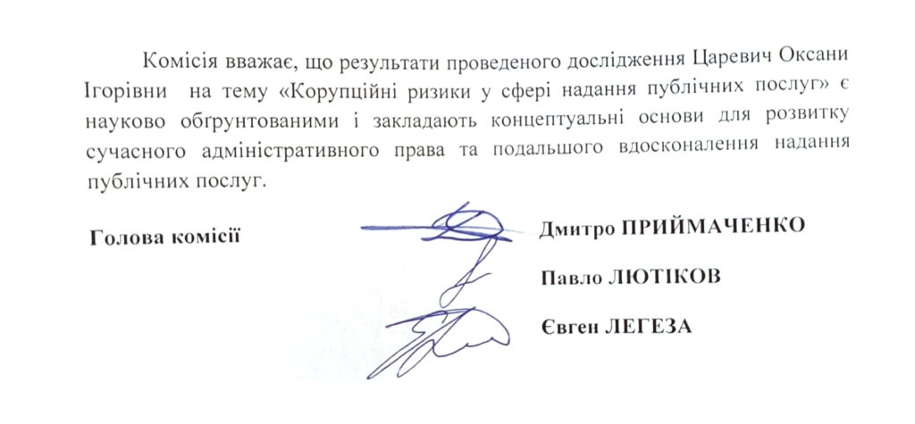 Мабуть, таким твердженням керувалася суддя Царевич, коли обирала тему майбутньої дисертації — “Корупційні ризики у сфері надання публічних послуг”. Фундація DEJURE та Антиплагіатна ініціатива “Дисергейт” провели аналіз “наукової” роботи судді Царевич.