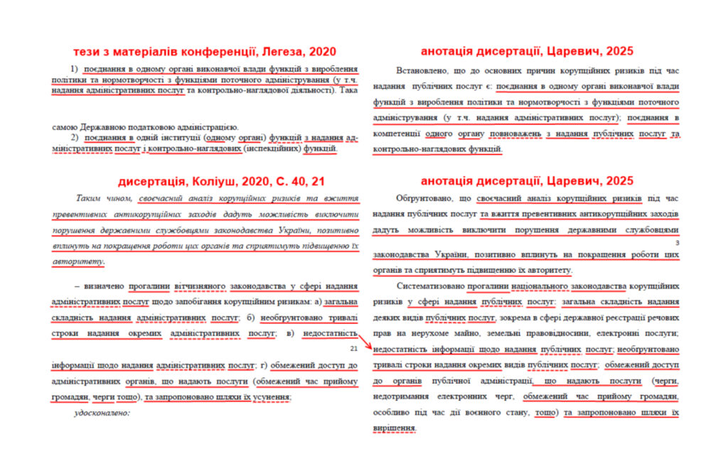 Перший і найбільш очевидний обман — це сама наукова робота. Дисертація Царевич є масштабним прикладом академічного плагіату, при чому — зробленого, схоже, за участі її ж наукового керівника, доктора юридичних наук Євгена Легези. Розберемо факти, які на це вказують.