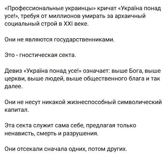 "Вони не є справжніми державниками. Це — гностична секта. Вони не мають жодного життєздатного символічного капіталу. Ця секта служить сама собі, пропонуючи лише ненависть, смерть і руйнування", — додав він.