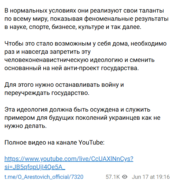 Як зазначає Арестович, політичне українство робить акцент на смерть і не створює доданої вартості ні для світу, ні для своїх. Арестович переконаний, що майбутнього у такого антипроєкту не існує.