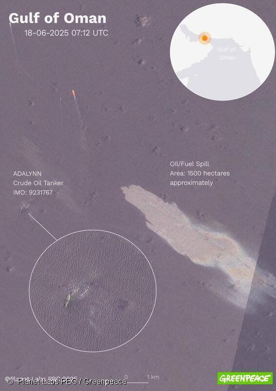 Співробітники Greenpeace повідомили про можливість значної екологічної катастрофи після зіткнення двох нафтових танкерів в Оманській затоці, між Іраном та ОАЕ. Супутники зафіксували нафту на площі близько 1500 гектарів.