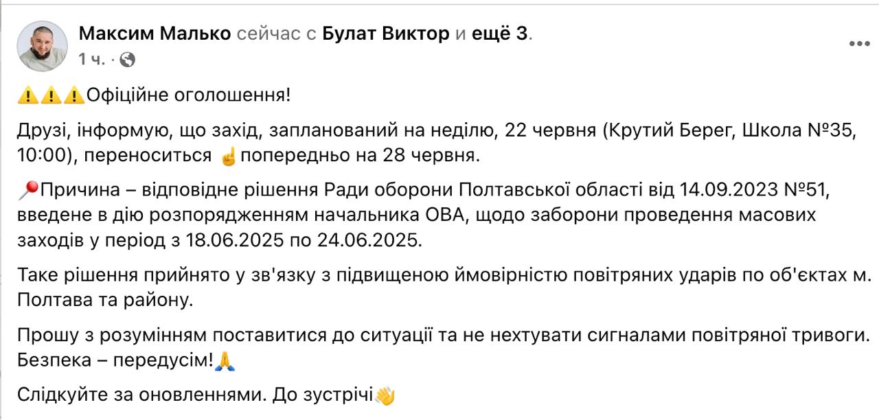 У Полтаві та регіоні на тиждень були заборонені масові заходи через підвищену загрозу обстрілів.