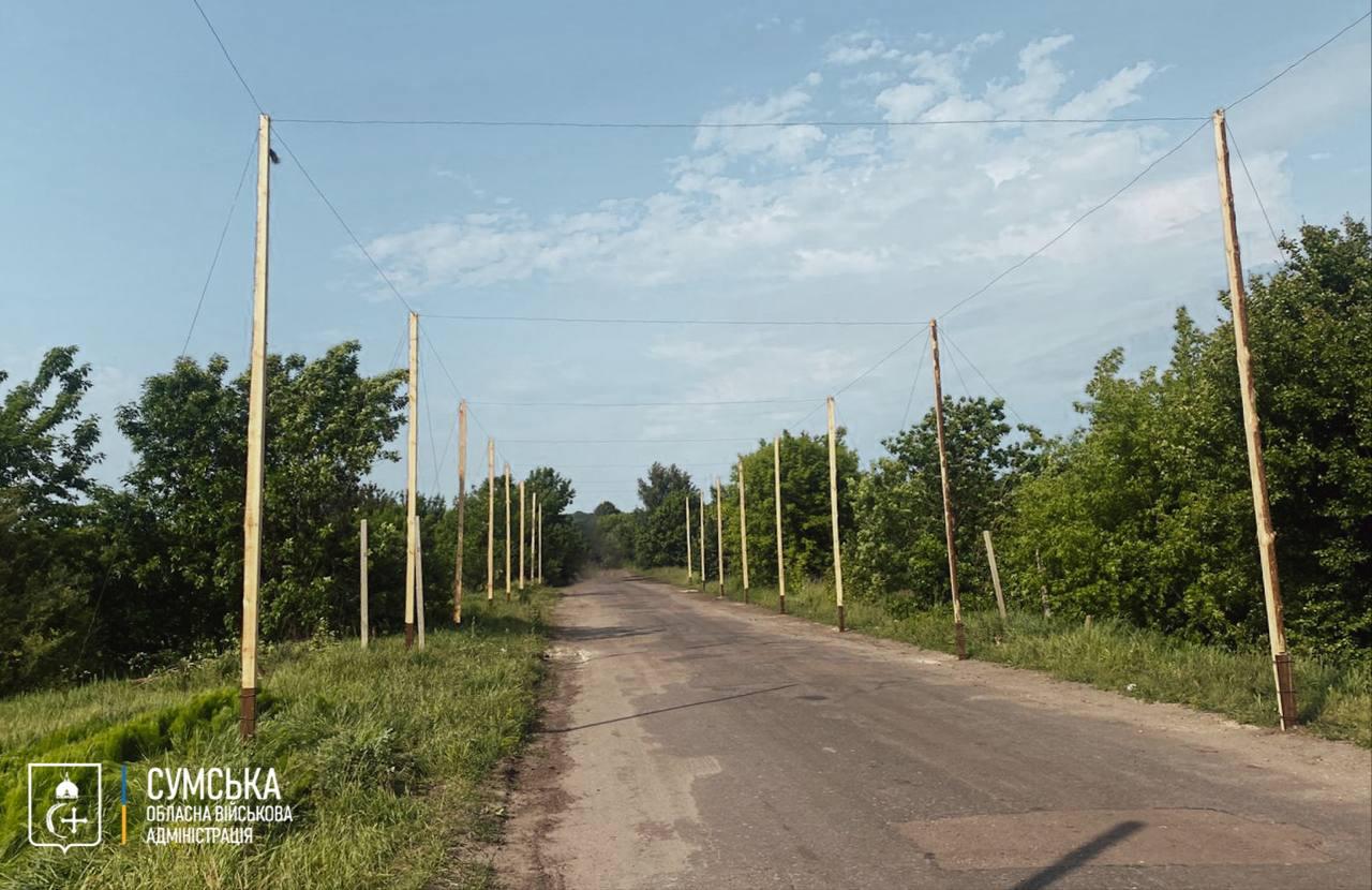 Обласна військова адміністрація Сумської області повідомляє, що над дорогами почали встановлювати захисні сітки від дронів.