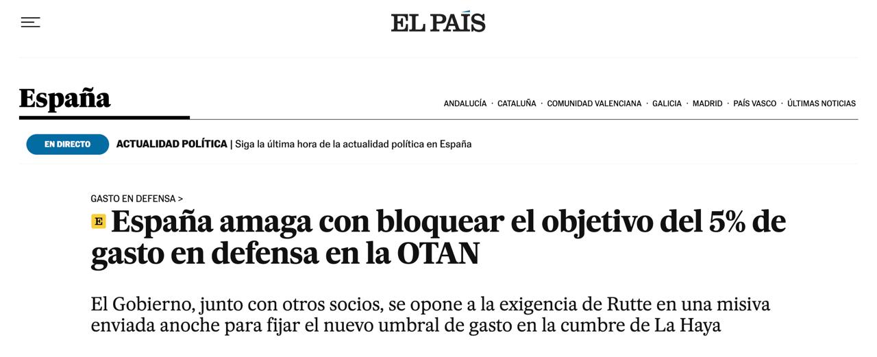 Іспанія та ще кілька країн можуть перешкодити підписанню на саміті НАТО зобов’язання щодо збільшення оборонних витрат до 5%, повідомляє El Pais з посиланням на поінформовані джерела.