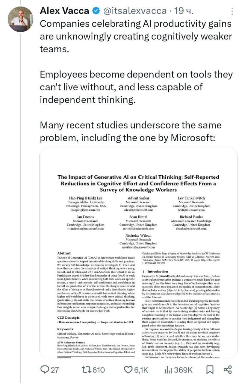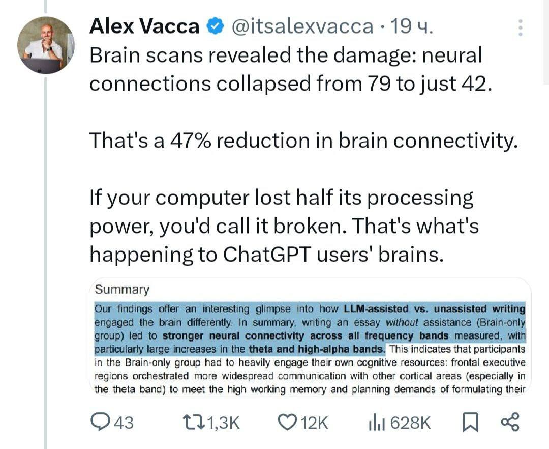 Автори дослідження зазначають: нейромережі економлять час і допомагають у роботі, але разом із цим відбирають здатність думати самостійно.