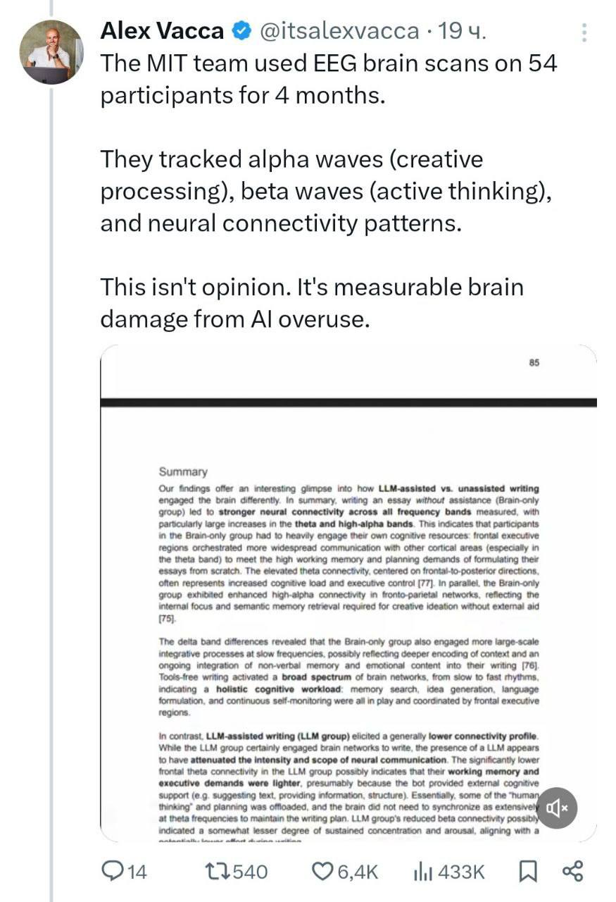 У тих, хто використовував ШІ, мозок працював найслабше: активність майже зникала, а переказати написане через кілька хвилин вони вже не могли.