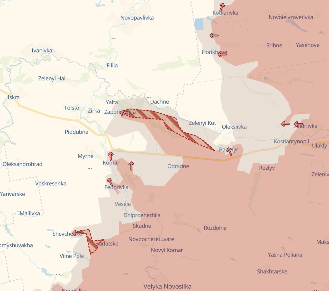 Російські сили домоглися тактичного просування на межі Запорізької та Дніпропетровської областей — в напрямку від Великої Новосілки, а також вздовж лінії Запоріжжя — Багатир.
