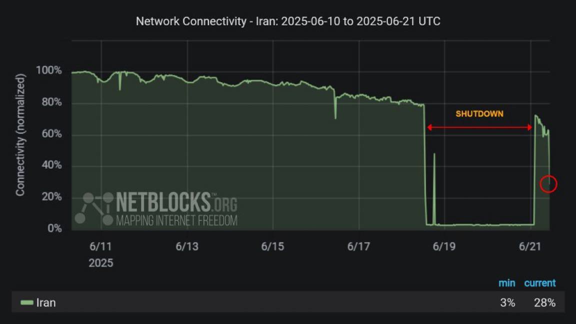 Агентство Tasnim News з посиланням на міністра інформації повідомляє, що надвечір доступ до "міжнародного" інтернету буде повністю відновлено по всій країні.