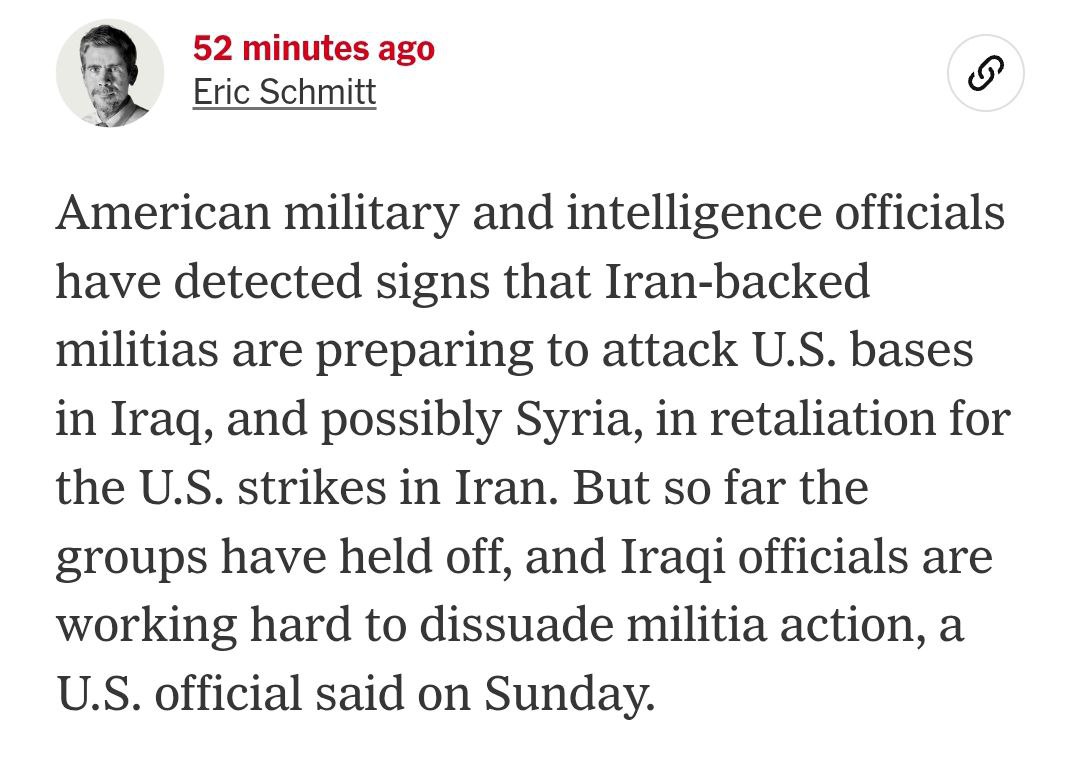"Однак на даний момент угруповання утримуються від дій, і іракська влада робить усе можливе, щоб переконати ополченців утриматися від атак", - повідомив у неділю представник США, зазначає NYT.