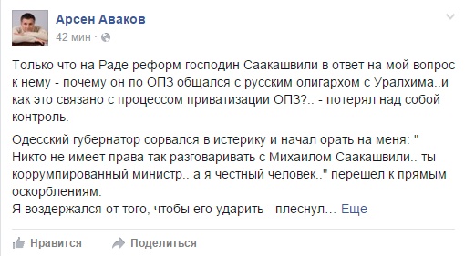 Только что на Раде реформ господин Саакашвили в ответ на мой вопрос к нему - почему он по ОПЗ общался с русским олигархом с Уралхима..и как это связано с процессом приватизации ОПЗ?.. - потерял над собой контроль.