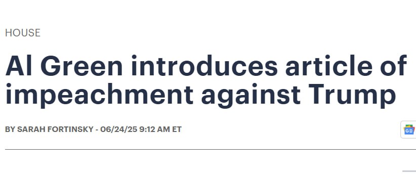 Конгресмен-демократ Ел Грін запропонував резолюцію про імпічмент Трампу за удари по Ірану без консультацій із законодавцями, повідомляє The Hill.
