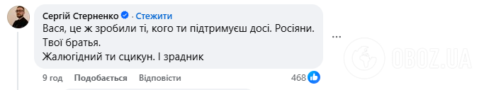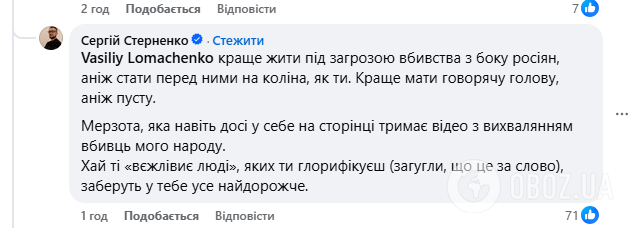 До перепалки приєднався волонтер і блогер Сергій Стерненко. Він звинуватив Ломаченка у зраді та боягузтві, назвавши його "мерзотою", яка продовжує прославляти "вєжлівих людей" - російських військових, які почали анексію Криму.