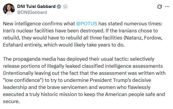 Посилаючись на нові розвідувальні дані, Тулсі Габбард заявила, що на відновлення об’єктів ядерної інфраструктури Ірану в Натанзі, Фордо та Ісфахані, які були пошкоджені внаслідок нещодавніх атак, знадобиться кілька років.