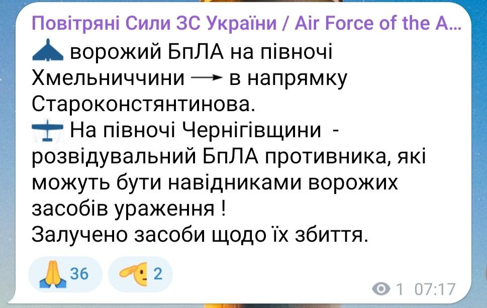 У Хмельницькій та Чернігівській областях зафіксовано активність ворожих безпілотників.
