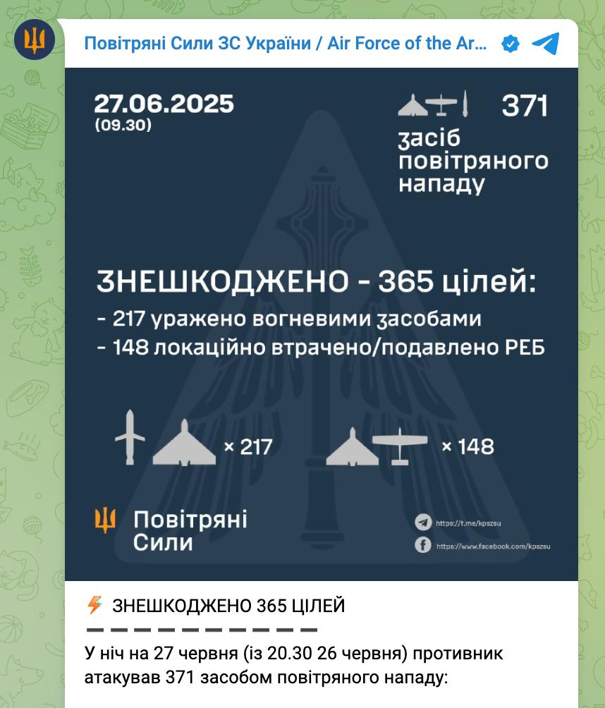 Загалом Росія атакувала 363 дронами-камікадзе типу «Шахед», з яких не вдалося збити або подавити чотири. Також не були перехоплені дві аеробалістичні ракети «Кинджал». Водночас усі шість крилатих ракет «Калібр» були успішно знищені силами ППО.