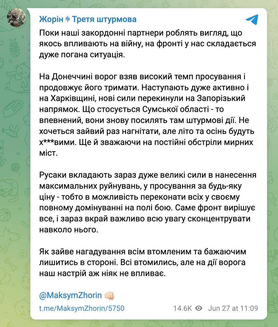 «Не хочеться додаткового нагнітання, але літо та осінь будуть несприятливими. Ще й з урахуванням постійних обстрілів мирних міст», - пише Жорін.