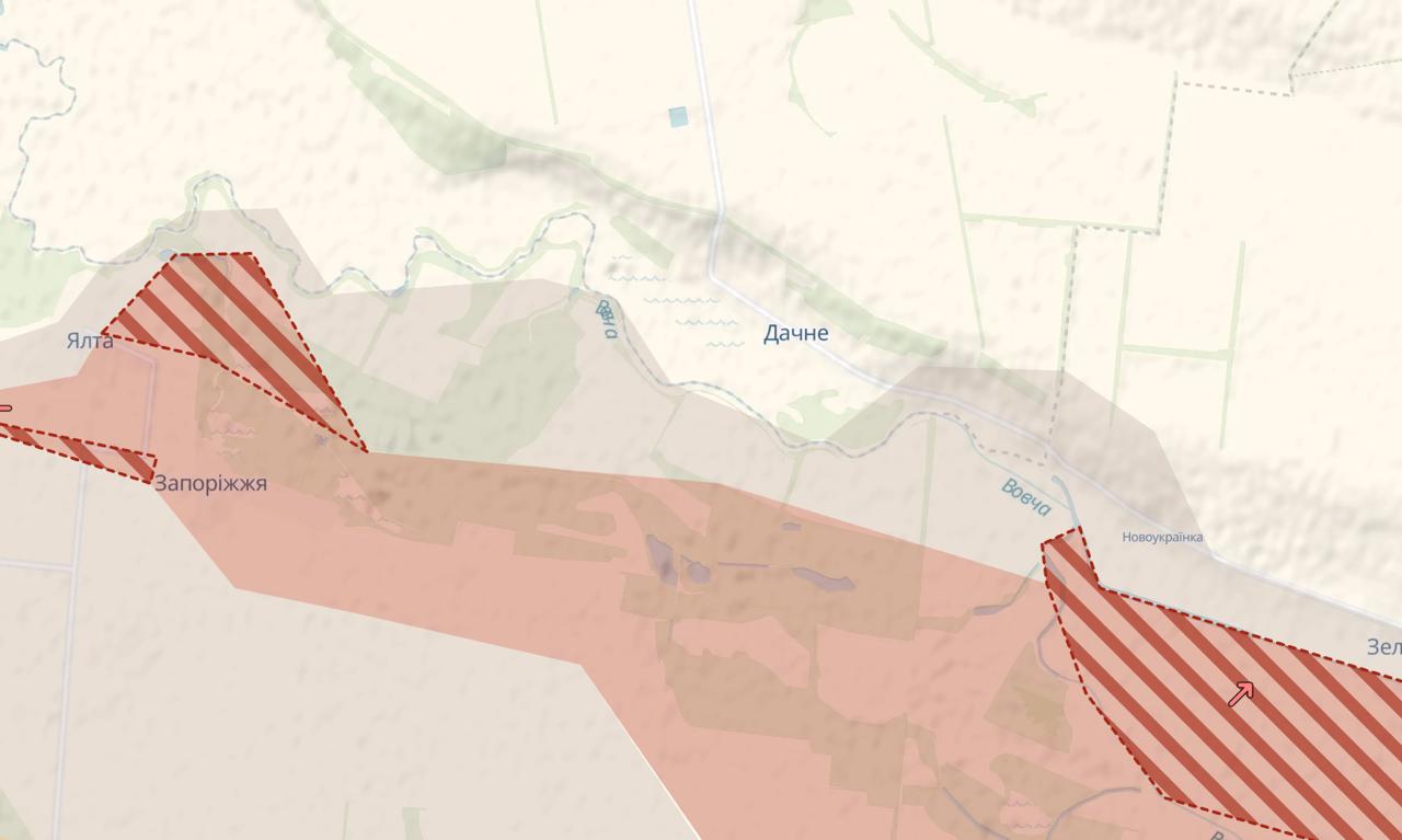 На півдні Донеччини, неподалік кордону з Дніпропетровською областю, зафіксовано просування армії РФ одразу на шести напрямках — від Шевченка, контроль над яким росіяни заявили ще кілька днів тому, до Ялти. Особливу увагу аналітики звертають на ділянку біля села Дачне, що вже входить до Дніпропетровської області — саме тут карта позначає появу сірої зони.