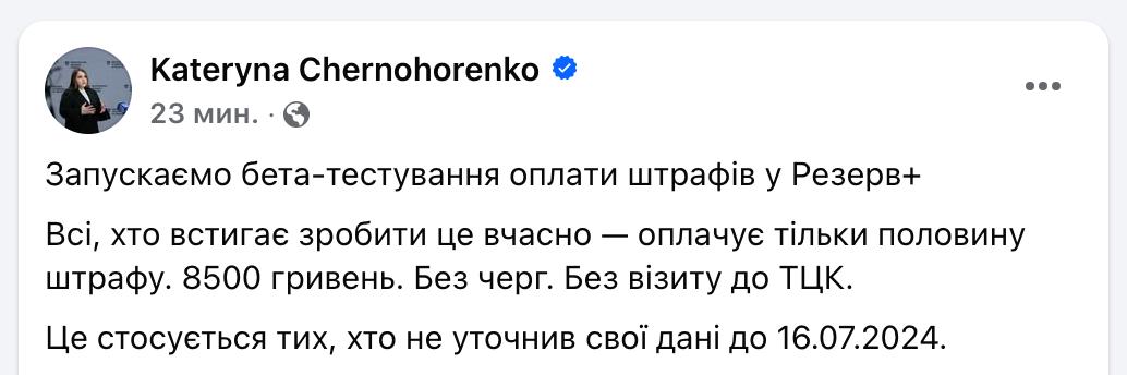 За словами заступниці міністра Катерини Чорногоренко, в застосунку "Резерв+" стартувало бета-тестування функції онлайн оплати штрафів.