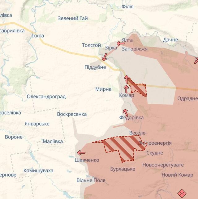 Згідно з інформацією від DeepState, російська армія просунулася в Новосергіївці поблизу кордону з Дніпропетровською областю.