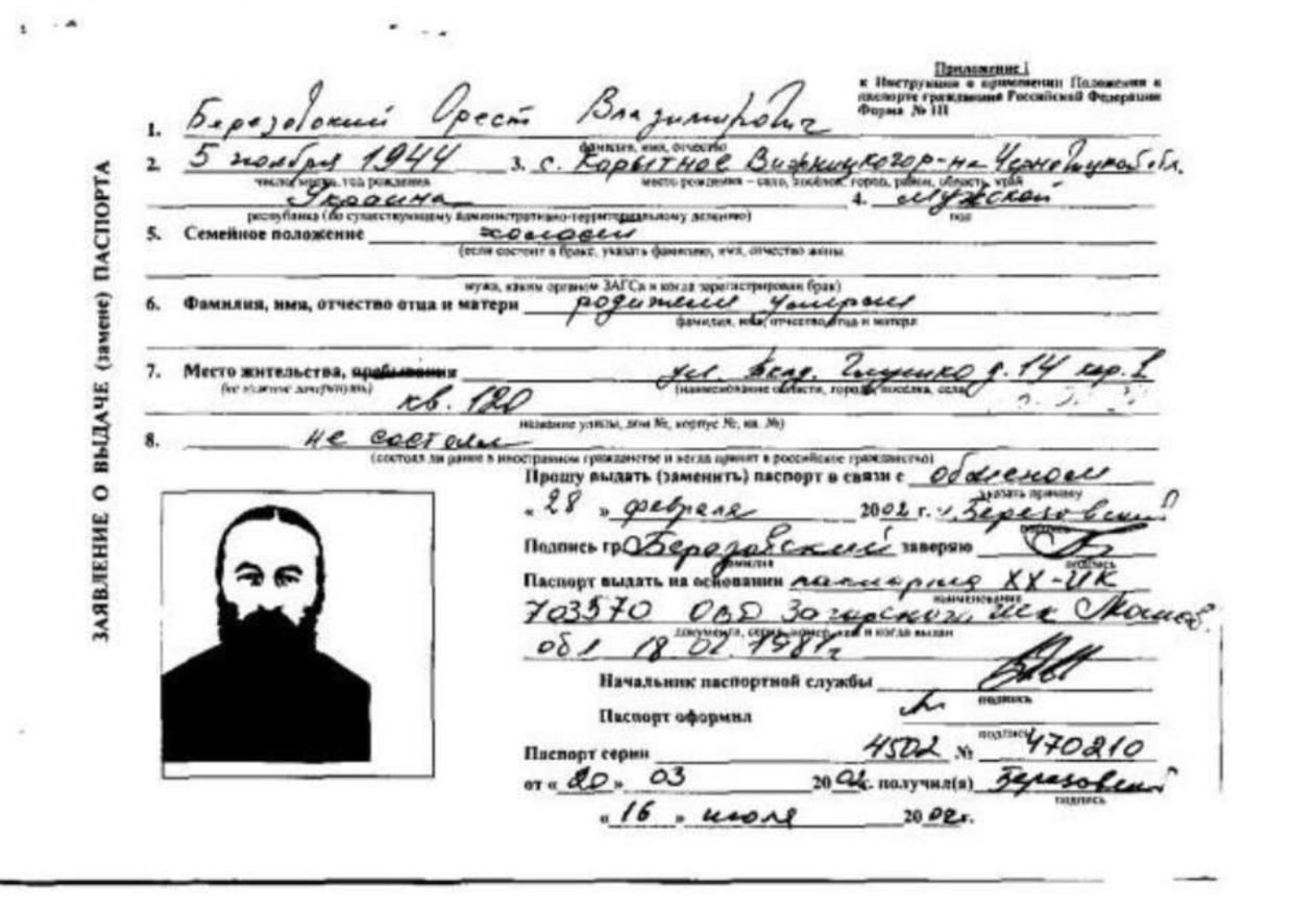 Паспорт на ім’я Березовського був виданий у березні 2002 року в ОВС по району Північне Бутово в Москві. Священнослужитель був зареєстрований у столиці.