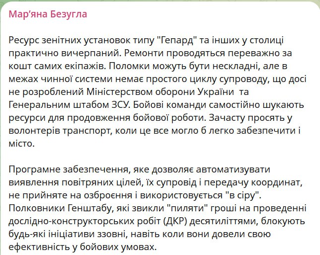 Народна депутатка Мар’яна Безугла заявила, що ресурс зенітних установок типу "Гепард" та інших систем протиповітряної оборони у столиці практично вичерпано.