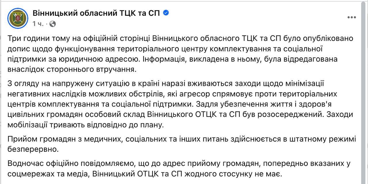 Вінницький територіальний центр комплектування (ТЦК) заявив, що їхнє попереднє повідомлення про нібито зміну адреси було відредаговане «в результаті стороннього втручання».