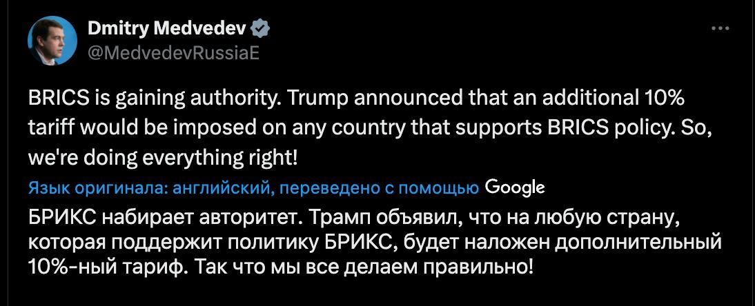 «БРІКС зміцнює свій авторитет. Трамп заявив, що на будь-яку країну, яка підтримує політику БРІКС, буде запроваджено додаткове 10%-ве мито. Значить, ми йдемо у правильному напрямку!» - зазначив заступник голови російської Ради безпеки.
