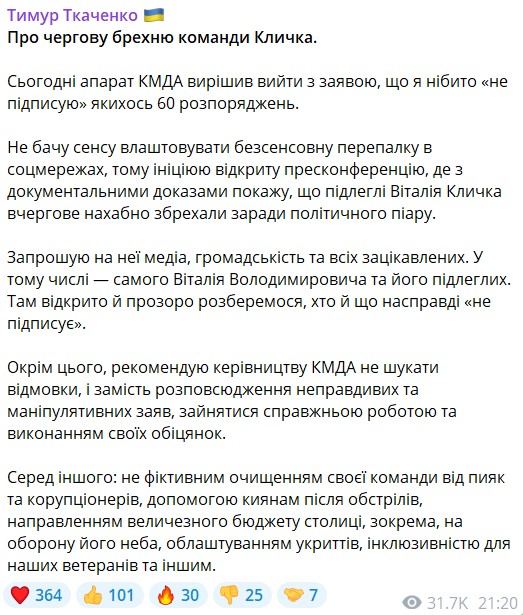 "Не вбачаю сенсу влаштовувати безглузду суперечку в соцмережах, тому ініціюю відкриту пресконференцію, де з документальними доказами покажу, що підлеглі Віталія Кличка вкотре нахабно збрехали заради політичного піару. Там відкрито й прозоро розберемося, хто і що насправді "не підписує" — написав Ткаченко.