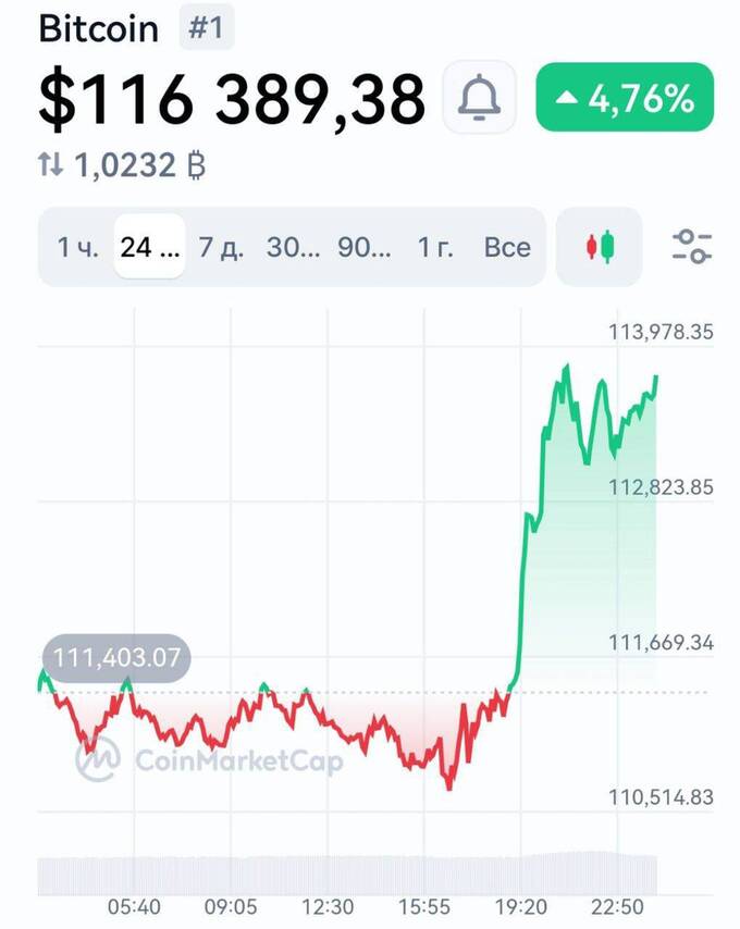 Ціна основної криптовалюти досягла $116 046,44. Загалом з початку року біткоїн подорожчав приблизно на 24%.
